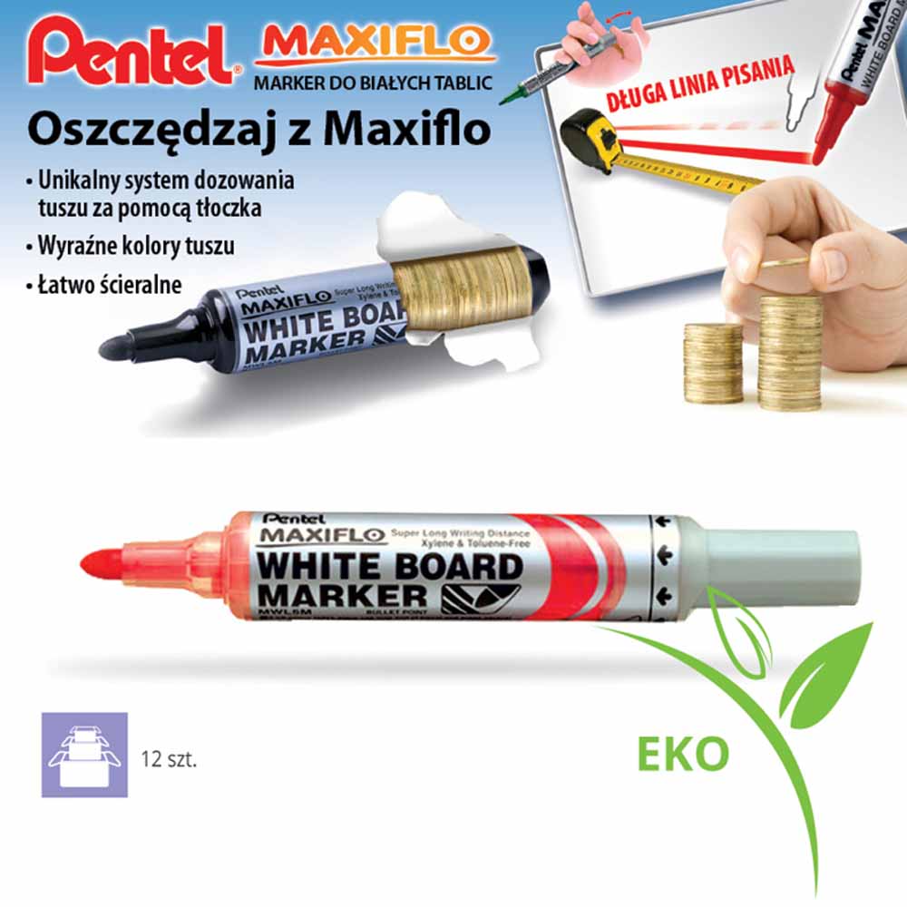 Marker do tablic suchościeralnych Pentel MWL5M Maxiflo został wykonany w 50% z materiałów przetworzonych, co czyni go bardziej przyjaznym dla środowiska. Dodatkowo, ten marker nie zawiera substancji trujących, co zapewnia bezpieczeństwo użytkowania zarówno dla dorosłych, jak i dzieci. Wybierając marker Pentel Maxiflo, dbasz nie tylko o jakość pisania, ale także o planetę i zdrowie użytkowników.
