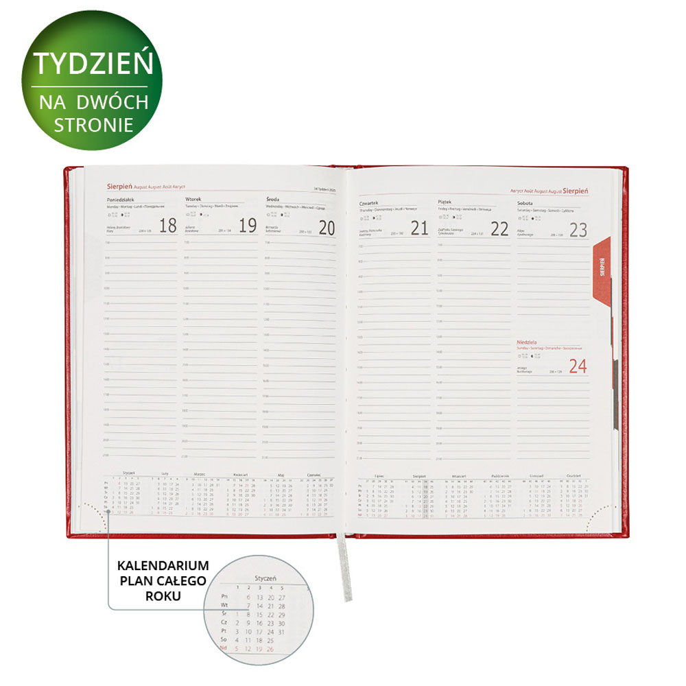 - kalendarium: PL/EN/DE/RUS/FR, imieniny i święta, fazy księżyca i zachody słońca, na dole kalendarium plan całego roku