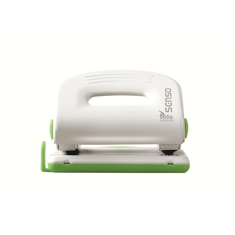 Dziurkacz posiada zaawansowany ogranicznik formatu z podglądem, który umożliwia precyzyjne dostosowanie dziurkowania do różnych formatów: A4, US, A5, F3x8, A6, 3x8. Dodatkowe wgłębienia w tylnej części podstawy są zgodne z rozstawem ringów w segregatorze, co pozwala na szybkie dziurkowanie bez konieczności używania listwy formatowej. Wskaźnik środka strony oraz łatwy do otwierania pojemnik na ścinki zapewniają wygodę i czystość w miejscu pracy.