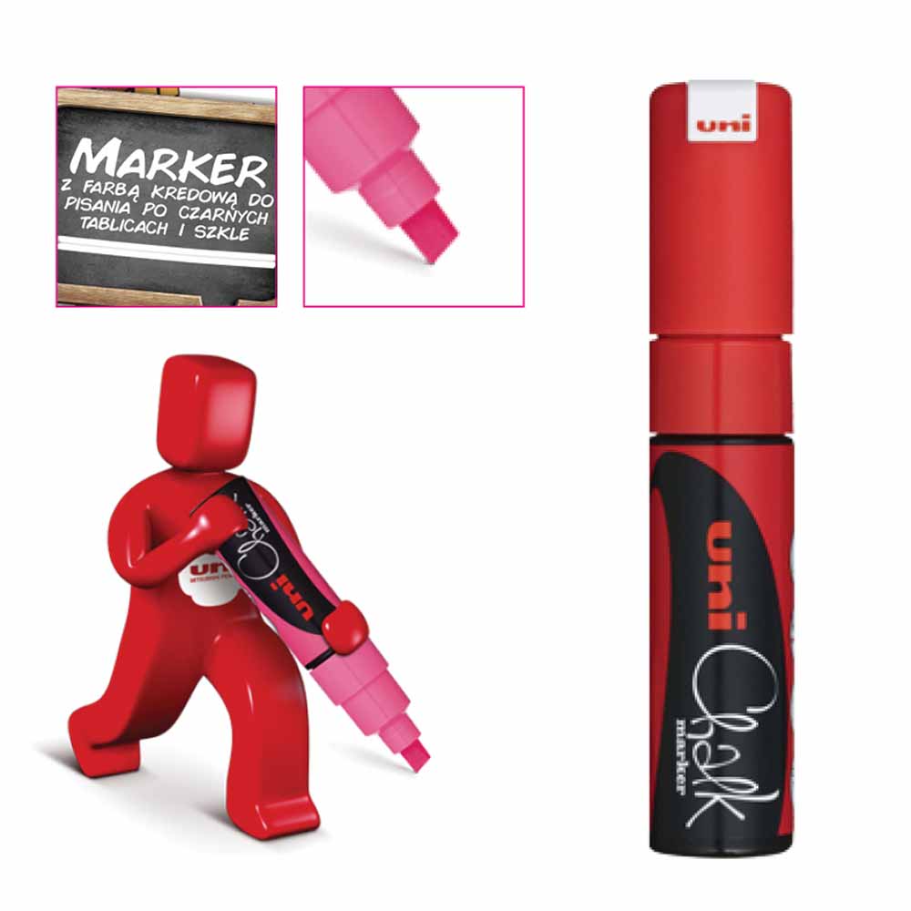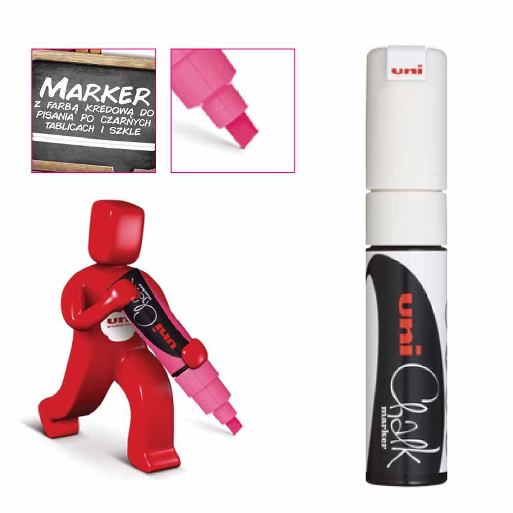 Marker UNI PWE8K oferuje grubość linii pisania 8 mm, co zapewnia wyraźne i czytelne oznaczenia. Idealny do tworzenia dużych, eleganckich napisów i rysunków na tablicach kredowych i szkle.