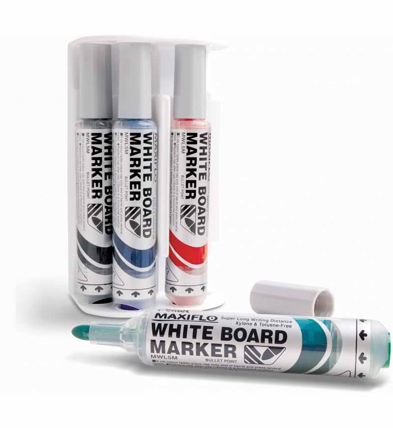 Zestaw markerów do tablic suchościeralnych Pentel MW85, w skład którego wchodzą cztery kolory: czarny, czerwony, niebieski i zielony, wyposażony jest w okrągłą końcówkę, która zapewnia precyzyjne i płynne pisanie. Idealny do prezentacji, notatek i rysunków na tablicach suchościeralnych.