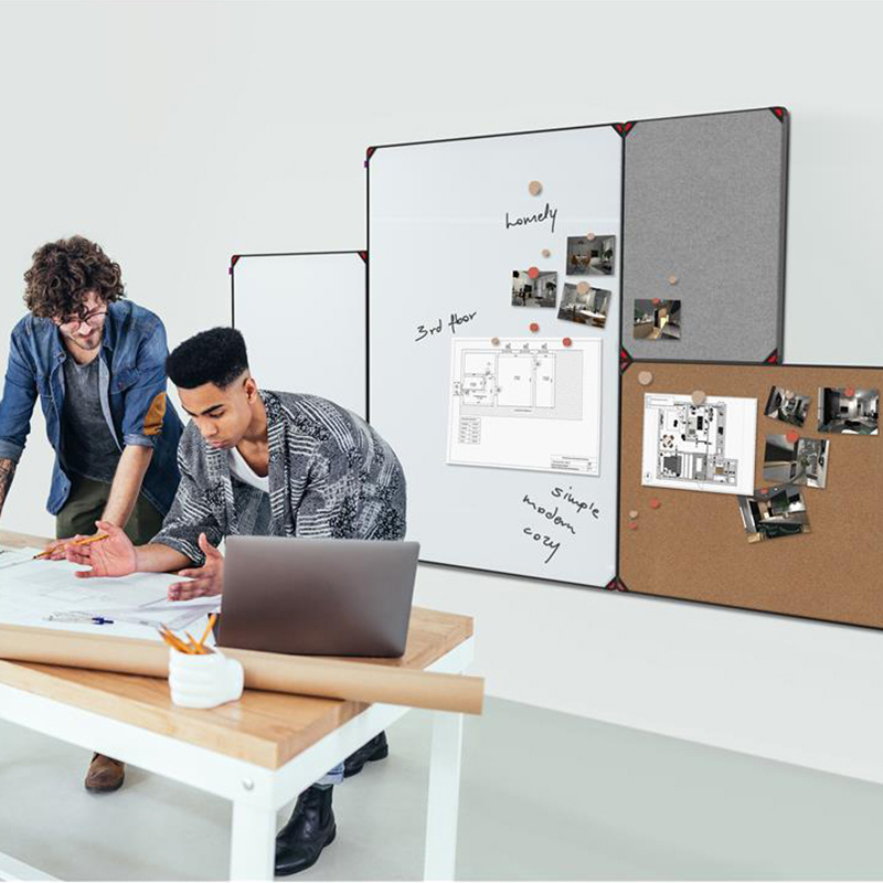 Tablica została osadzona w wąskiej ramce z anodowanego aluminium, która nadaje jej nowoczesnego wyglądu. Dzięki innowacyjnej konstrukcji narożników, tablica jest niezwykle stabilna i wytrzymała. W zestawie znajdują się dwie opcje zaślepek narożników – klasyczne szare lub odważne czerwone, które pozwalają dostosować wygląd tablicy do własnych preferencji.