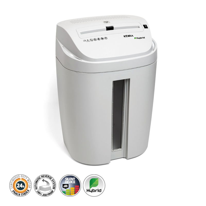 Niszczarka bez problemu radzi sobie nie tylko z papierem, ale także z kartami plastikowymi, płytami CD i zszywkami. Pojemność kosza wynosząca 12 litrów oraz wbudowane okno w obudowie umożliwiają łatwe kontrolowanie poziomu napełnienia i wygodne opróżnianie.