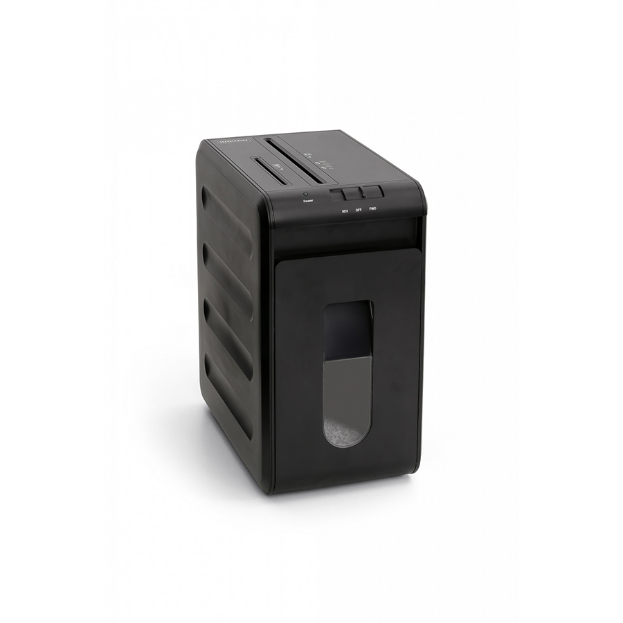 Obudowa niszczarki jest wyposażona w okno umożliwiające kontrolę poziomu napełnienia kosza, a system Eco-Friendly pozwala na korzystanie z pojemnika na ścinki bez potrzeby stosowania worków. Automatyczne odcięcie zasilania w przypadku zaklinowania papieru lub wyjęcia pojemnika na ścinki to dodatkowa funkcja, która chroni urządzenie przed uszkodzeniami.