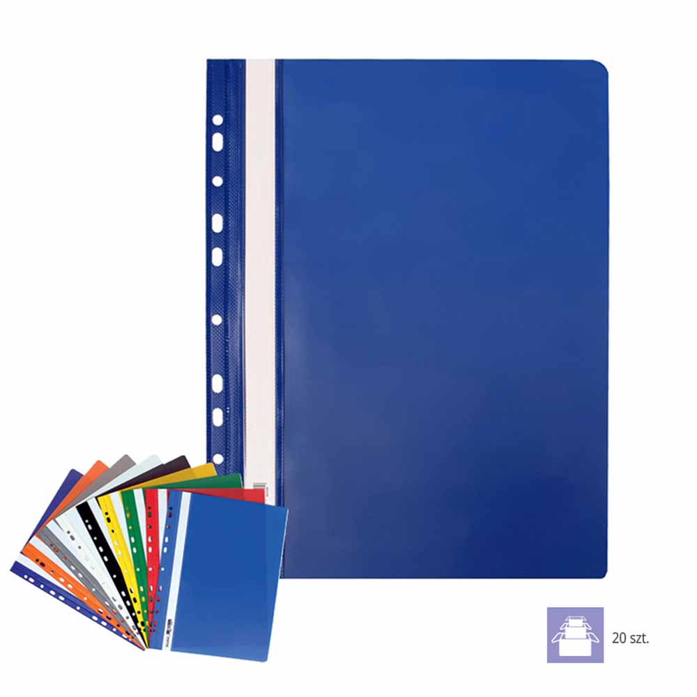 Boczna perforacja pozwala na łatwe wpięcie skoroszytu do segregatora z dowolnym mechanizmem, co zwiększa możliwości organizacji i archiwizacji dokumentów. Wewnętrzna blaszka i wąs o długości 14,5 cm umożliwiają bezpieczne przechowywanie dokumentów o grubości do 20 mm.