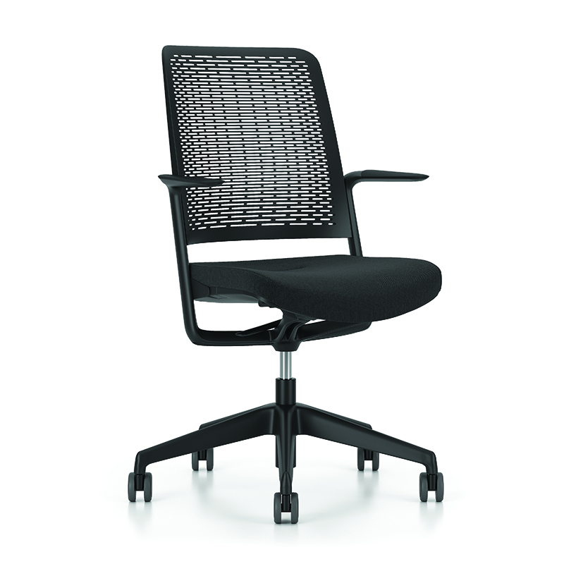 Ergonomiczna konstrukcja fotela FACTOR zapewnia wygodę nawet podczas wielogodzinnej pracy. Oparcie wykonane z elastycznej siatki gwarantuje odpowiednią cyrkulację powietrza, a miękkie siedzisko tapicerowane pianką i tkaniną w kolorze czarnym zapewnia komfort użytkowania.