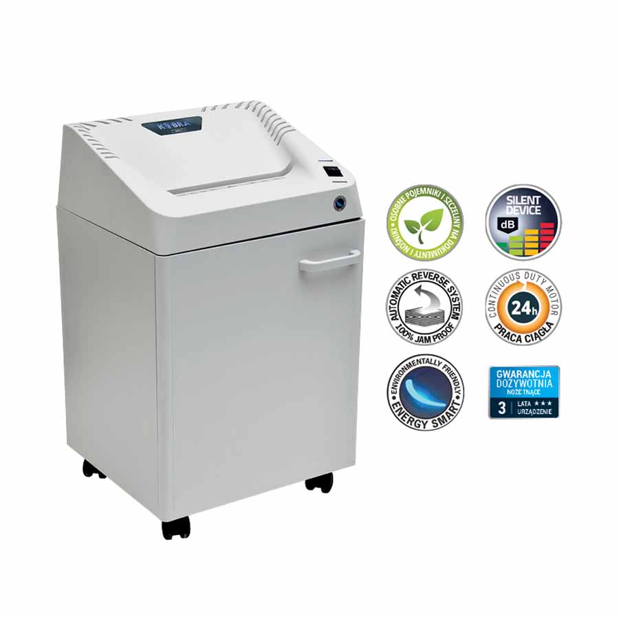 Niszczarka Kobra +3 CC4 ES to niezawodne urządzenie zaprojektowane z myślą o średniej wielkości biurach i urzędach, które potrzebują wydajnego i bezpiecznego rozwiązania do niszczenia dokumentów. Wyposażona w specjalną pokrywę, która automatycznie wstrzymuje pracę przy jej podniesieniu, niszczarka gwarantuje pełne bezpieczeństwo użytkowania.